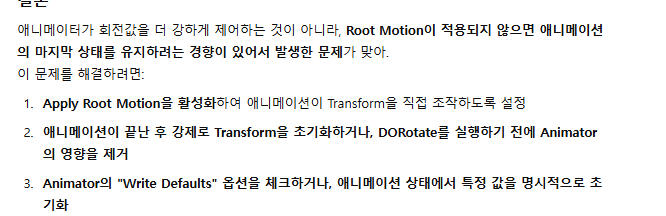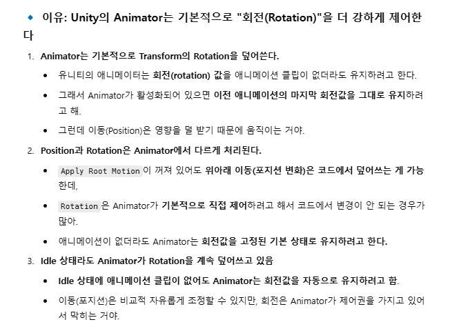 이는 GPT에게 물어봤을 때 답해준 애니메이터가 기본적으로 회전값을 더 강하게 제어하는 것이 아니라,