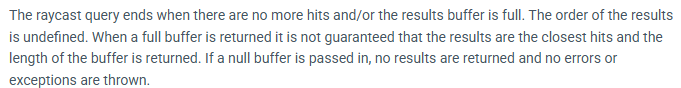 Unity의 RaycastNonAlloc()은 충돌 정보를 배열에 저장하지만, 저장 순서가 거리순으로 보장되지 않는다.