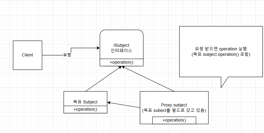 - OOP에서는 클라이언트가 객체를 직접 사용하는 것이 아닌 중간 프록시(대리인)을 거쳐 사용하는 패턴